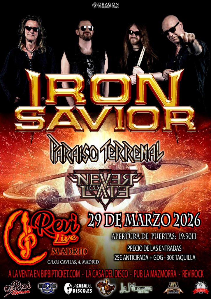 Evento: IRON SAVIOR + PARAÍSO TERRENAL + NEVER TOO LATE Bandas: Iron Savior + Paraíso Terrenal + Never Too Late Fecha: 29 marzo 2026 Entradas: aquí